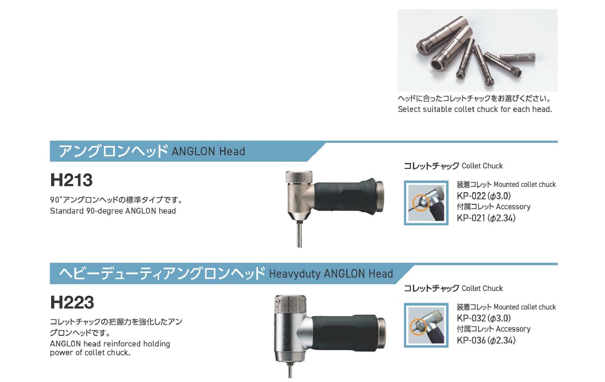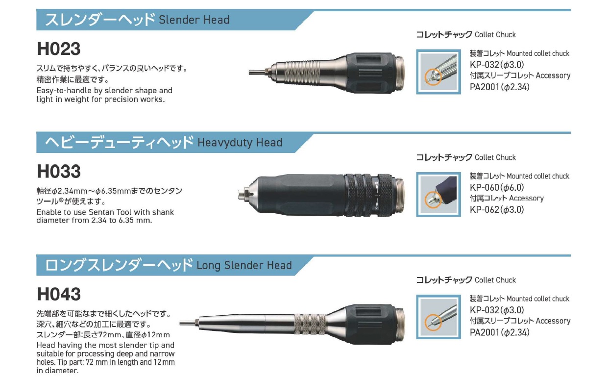 Minimo Precision Electric Hand Grinder, Standard head, Slender head, Heavy duty head, Long slender head, Anglon head, Heavy duty anglon head, Anglon 120 hend, Rubron head (variable amplitude type)Collet chuck compatibility table
