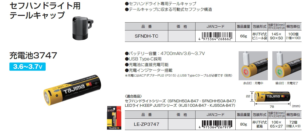 Tajima LED Hand Light, Safety Hand Light Heater, Handlight, Tail Cap for LED Hand Light, Rechargeable Battery