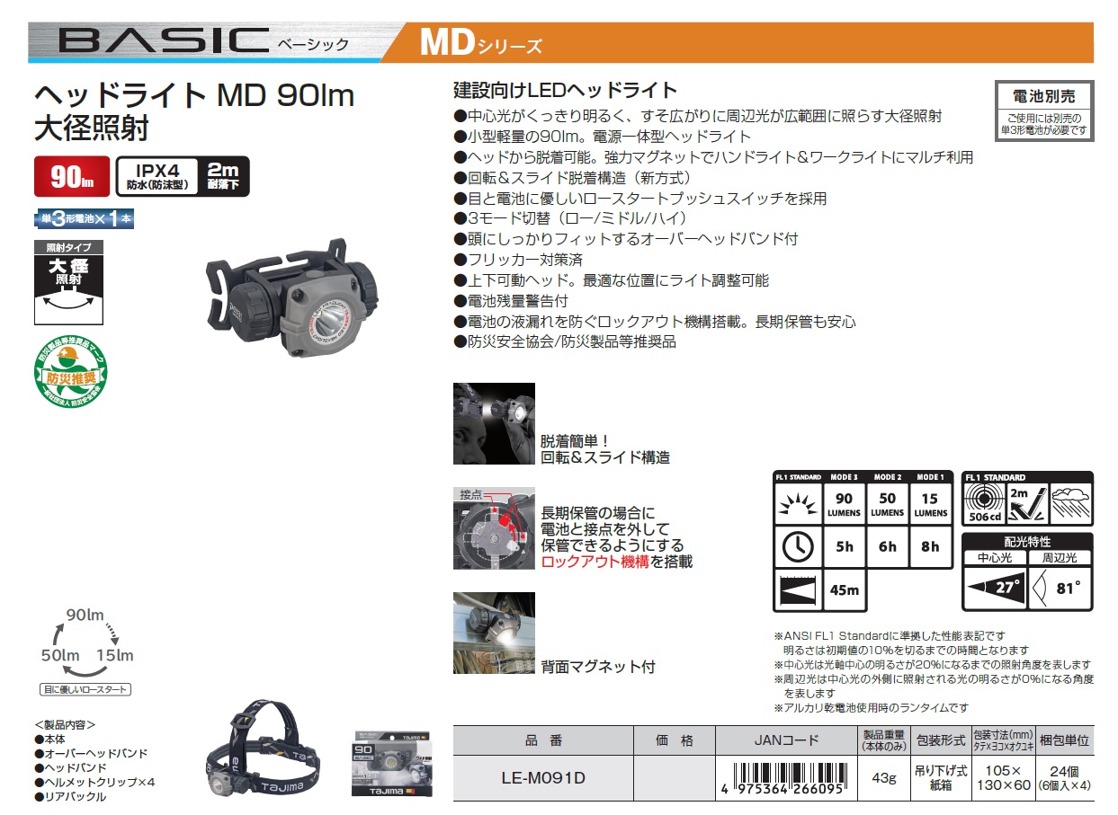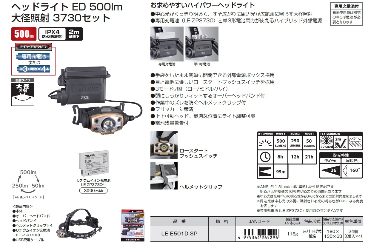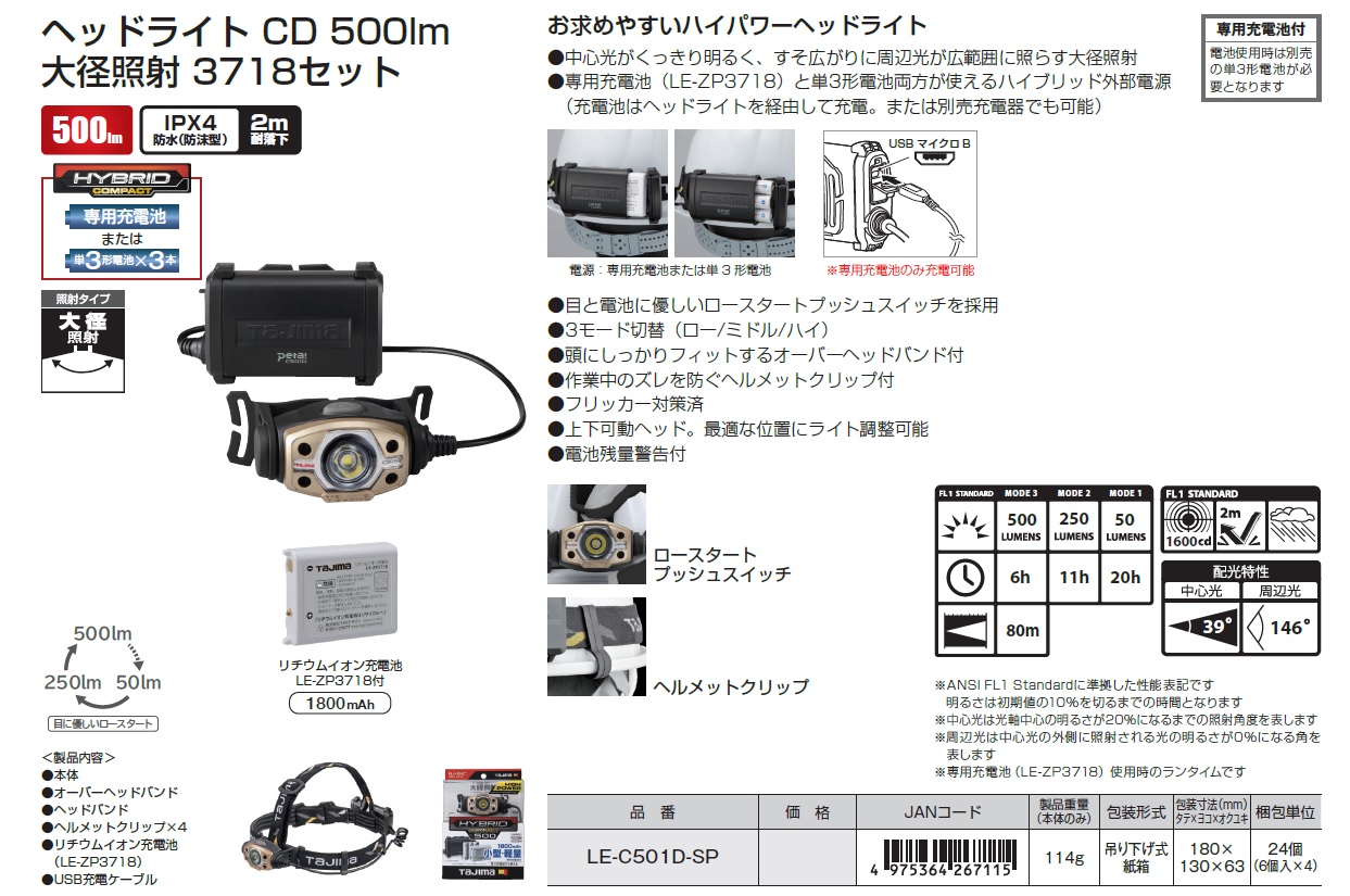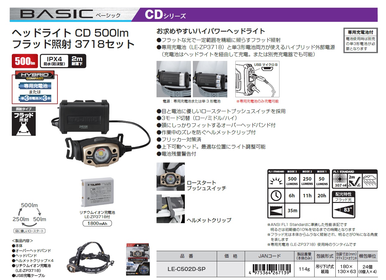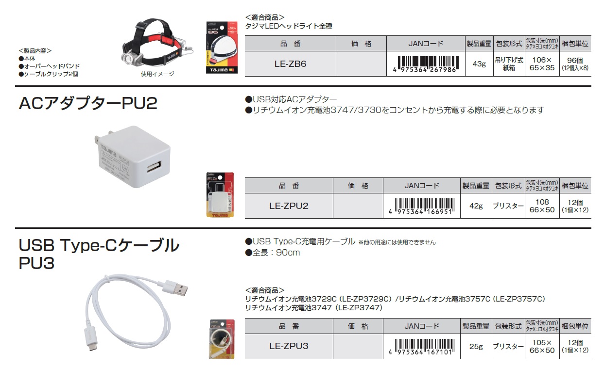 Tajima LED Headlight, Rechargeable Battery, AC adapter, USB Charging Cable, Lithium-ion Battery
