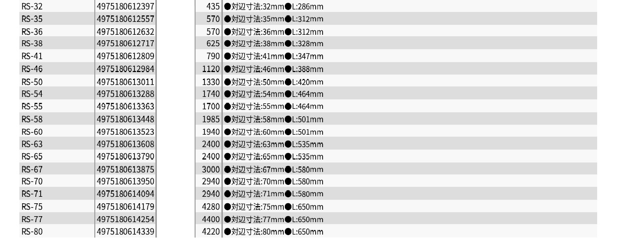 RS-5.5, RS-6, RS-7, RS-8, RS-9, RS-10, RS-11, RS-12, RS-13, RS-14, RS-17, RS-19, RS-21, RS-22, RS-23, RS-24, RS-26, RS-27, RS-29, RS-30, RS-32, RS-35, RS-36, RS-38, RS-41, RS-46, RS-50, RS-54, RS-55, RS-58, RS-60, RS-63, RS-65, RS-67, RS-70, RS-71, RS-75, RS-77, RS-80