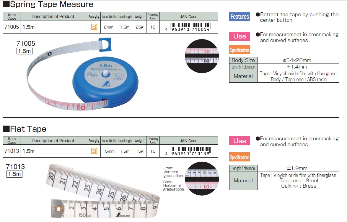 Shinwa - Shinwa Spring Tape Measure, Flat Tape