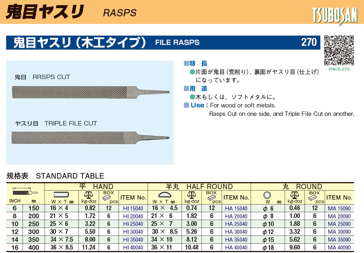 Tsubosan MILL SAW FILES, UND CHAIN SAW FILES, FEATHER EDGE SAW FILES, FILES FINISHING (Japanese Market), SLIM FILES, FARMER'S FILES, CURVED TOOTH FILES, SOFT WORK FILES, CURVED TOOTH FILES, WOODCRAFT FILES, Chemical Polishing, CURVED TOOTH BLADES, RASPS, FILE RASPS, BOARD RASPS, CABINET FILES, MODIFICATION FILES, SCREW THREADS FILES, AWL, MODIFICATION FILES, VERY THIN HAND DITCH FILES, TRIMMING KNIFE, SHARPENING STEEL, HAND LAPPER, HARDNESS TESTER (HRC40 ~ HRC65)