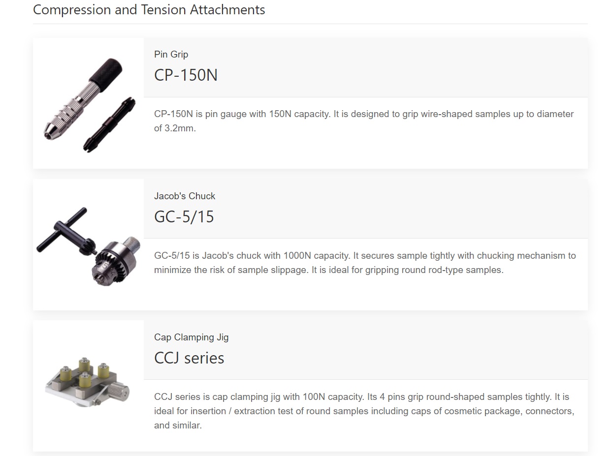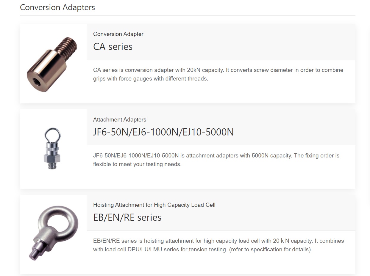 Idama Small Hook, Flat Tip, Conical Tip, Chisel Tip, Extension Shaft, Notched Tip, Large Hook, Y Hook, Flat Tip, Small Hook, Conical Tip, Chisel Tip, Extension Shaft, Notched Tip, Mounting Bolts, Handles, Soft-padding Compression Jig, Film Puncture Testing Fixture, Pin Gauge, 3-Point Bending Test Fixture, Press Test Fixture, Compression Plates, Disk-shaped Jig for High Load Compression Testing, Rectangular Jig for High Load Compression Testing, Spherical Jig for High Load Compression Testing, Urethane Spherical Compression Jig, Flip Cap Opening Force Test Hook, Double Arm Hook, Film Grip, Flat Chuck, Wedge Grip, Pantograph Grip, Small Grip, Fine Point Chuck, Roller Grip, Cam Grips, Wire Winding Grip, Can Opening Fixture, Hook for Corrugated Cardboard Adhesion Test, Knurled Cam Grip, Attachment for Polypropylene (PP) Strapping Band Tension Test, Loop Tension Strength Testing Fixture, Terminal Clamp Jig, Rotary Wire Terminal Fixture, Wire Clamp Jig, Terminal Clamp Jig for Crimp Pull Test, Grip for Tenion Strength Test of Sewed Buttons, Fixture for Tension Strength Test of Sewed Buttons, 90 degree Peel Test Fixture, 45 Degree Peel Test Fixture, 180 degree Peel Test Fixture, Coating Surface Peel Test Fixture, ariable Weight Reciprocating Friction Test Jig, Coefficient of Friction Fixture, Pin Grip, Jacob's Chuck, Cap Clamping Jig, QFP Lead Hook/Chip Shear Jig, Alignment Stage for Solder Joint Strength Test, Chip Peel Fixture, Attachment for Needle Bonding Strength Test, Attachment for Probe Tack Test, Attachment for Compression Testing of Syringe, Attachment for Acupuncture Needle: Strength and Sharpness, TXS/DTXA series Standard Table, Light Weight Small Table, Light Weight Wide Table, Small Table, Pin Chuck, Torque Driver, M10 Adapter, 9.5mm Square Socket Holder, Pin Chuck, Small Table, Light Weight Small Table, M10 Adapter, MTS series Upper Chuck, MTS series Small Chuck, Pin Chuck, Sample Stage, Rotation Support Jig for DTXS/A, Rotation Support Jig for HTGS/A, Sensor Holder, Yogurt Cutter, Vice Pin, 3-point Bend Test Table, Disk Probe, Conical Probe, Cylindrical Probe, Sphere Probe, Special Grip for Noodle, Small Grip, Film Grip, Cutter, Wire-cutter, Wedge Probe, Wide Table, Center Lined Table, Table with a Trench, Container Holder Table, Anti-Scattering Sheet, Sample Holder Table, Stick Holder, Stick Guide Plate, Pinching Force Measurement Jig, Self-centering Vise Grip, Vise Grip, Self-centering Vise Grip, XY-Table, X-axis Slide Table, T-Slot Table, Optional Handles for Force Gauge, Hand Grip Belt, Optional Handle for A Fire Door Closing Measurement, Conversion Adapter, Attachment Adapters, Hoisting Attachment for High Capacity Load Cell, Universal Joint, Interlocking Shield Option for Motorized Test Stand, Safety Shield,Rubber Roller for Peel Test, Grip Mounting Adaptor, Film Cutter, Optional Tray, Pen shaped Load Cell, Standard Type Load Cell, Waterproof and Dust-proof Load Cell, Small Type Load Cell, High Capacity Load Cell, Extra Small Load Cell, High Accuracy Type Load Cell, High Capacity Load Cell, Load Cell for Closing Force of Car Windows and Doors, Load cell for Two-wheeler Handbrakes, Load Cell for Automatic Doors (Door Tester), Torque Load Cell, Built-in linear Scale, Angle Meter Kit, Mitutoyo Digimatic Mini Processor (Printer), Wireless Data Transmit System