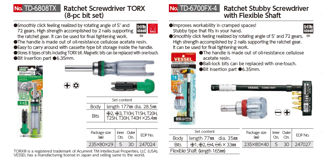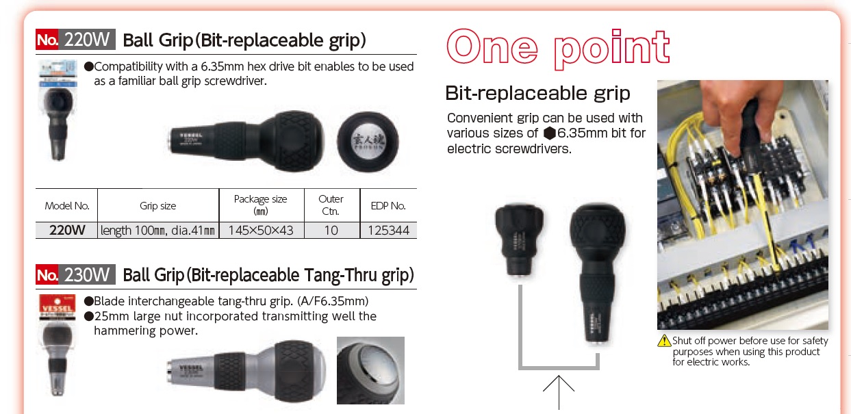 Vessel Super Cushion Screwdriver, Cushion Grip Screwdriver (Thin Shank Type), Super Cushion Screwdriver (Stubby Type), Cushion Grip Screwdriver (Stubby Type), Super Cushion Tang-Thru Screwdriver, Cushion 4-way Stubby Screwdriver, Ball-Grip Screwdriver, Free-Turning Ball Grip Screwdriver (Screwdriver only), Ball-Grip Insulated Screwdriver, Ball-Grip Tang-Thru Screwdriver, Ball-Grip Screwdriver (With covered shank), Tang-Thru Screwdriver w/Ceramic Ball (For electric works), Ball Grip (Bit-replaceable grip), Ball Grip (Bit-replaceable Tang-Thru grip), Cushion Stubby (Bit-replaceable grip), Cushion Grip TORX Screwdriver, Ball Ratchet Screwdriver, "NEON" Screwdriver, Ball Ratchet Screwdriver Replacement Blade, Anti-drop Slim Cord, MEGADORA IMPACTA, MEGADORA Standard Screwdriver Extra Long Type, MEGADORA Standard Screwdriver, MEGADORA Stubby Screwdriver, MEGADORA Stubby Screwdriver, MEGADORA Tang-Thru Screwdriver, MEGADORA Clip Remover, MEGADORA Pozidriv Screwdriver, MEGADORA Chisel-Type Screwdriver, MEGADORA Insulated Screwdriver, MEGADORA Insulated Screwdriver, "CRYSTALINE" Screwdriver, "CRYSTALINE" Screwdriver, "CRYSTALINE" Screwdriver (Long Shank Type), "CRYSTALINE" Screwdriver (Thin Shank Type), "CRYSTALINE" Screwdriver (Precision Type), Long Square Shank Screwdriver, "CRYSTALINE" Screwdriver (Stubby Type), "CRYSTALINE" Screwdriver (Thin Shank Type) "CRYSTALINE" Screwdriver (Precision Type) "CRYSTALINE" Screwdriver(Stubby Type),Long Square Shank Screwdriver, Non-Slip Tang-Thru Screwdriver, Power Socket Screwdriver, POZIDRIV Screwdriver, Power Grip TORX Screwdriver, Power Grip Screwdriver, Power Grip UltraBall Screwdriver, 3-Point Screwdriver, TORX Screwdriver Set, KOMADORA Stubby Screwdriver, 3-Point Cross Screwdriver, KOMADORA Stubby Screwdriver, Hex Screwdriver Set, "FAMIDORA" Reversible Blade Screwdriver, “Dual-Tone” Screwdriver Set, "FAMIDORA 12" Screwdriver 12-Piece Set, "FAMIDORA 8" Screwdriver 8-Piece Set, "SEPADORA" Screwdriver, "SEPADORA" Screwdriver(Precision Type), "SEPADORA" Screwdriver (Thin Shank Type), "SEPADORA" Screwdriver(Stubby Type), ECO VALUE Screwdriver, ECO VALUE Screwdriver ( Stubby Type), ECO VALUE Screwdriver, ECOSOFT T-bar screwdriver(w/socket bit set), ECO VALUE Screwdriver (Precision Type), Powerful Tang-Thru Screwdriver, Wooden Handle Tang-Thru Screwdriver, Wooden Handle Tang-Thru Screwdriver (Long Shank Type), "SPLIT" Handle Screwdriver, Wood-Compo Screwdriver, Wood-Compo Tang-Thru Screwdriver, Wood-Compo S/D( w/hanging card), Wood-Compo Screwdriver ( Stubby Type), Wood-Compo TORX Screwdriver, Wood-Compo Ratchet Handle, Wood-Compo Socket Screwdriver, Wood-Compo Swivel Ratchet Handle, Wood-Compo Socket Wrench Set, Non-slip Tang-Thru Screwdrivers, Wood-Compo Socket Wrench Set, Wood-Compo Swivel Socket Wrench Set, G-grip Screwdriver, 3-Piece Micro Screwdriver Set, G-grip TORX Screwdriver, Micro Screwdriver, Precision Micro Screwdriver, Watch Band Pin Punch, Precision Nutdriver, Precision TORX® Screwdriver, Precision Hex Driver, Precision Micro Stix® Screwdriver, Precision Hex. Driver Set, Precision Screwdriver Set, Ceramic Adjuster, Replacement Ceramic Blade / Ceramic Blade Adapter, Precision Nut Driver Set, Ratchet Screwdriver (4-pc bit set, Ratchet Stubby Screwdriver, Ratchet Screwdrive (r 8-pc bit set), Ratchet Screwdriver TORX(8-pc bit set), Ratchet Stubby Screwdriver with Flexible Shaft, Power Ratchet Screwdriver, Ball Ratchet Screwdriver, T-Bar Ratchet Screwdriver, Ball Ratchet Screwdriver Replacement Blade, Flat-shaped Ratchet Screwdriver (straight type), Flat-shaped Ratchet Screwdriver (bent-up type), Flat Plate Ratchet Screwdriver Set, Plate Rachet Screw Catcher, Plate Rachet/Magnetic Screw Catcher (TORX), Plate Ratchet TORX Set, Replacement Bit Set, "PETADORA" Z-shaped Offset Screwdriver, 2-Piece Offset Screwdriver Set, "PETADORA" L-shaped Offset Screwdriver, LED Voltage Detection Screwdriver, Impact Driver, Impact Driver Bit, Impact Uni Driver, Ball Point Wrench Stubby (Short Type), Ball Point Wrench Stubby (Long Type), Ball Point Wrench (Extra Long Type), Ball End TORX Wrench, Tamper-proof TORX Wrench, T-Handle Screwdriver, Flag Handle Screwdriver, Flag Handle Screwdriver (Inch), Hex Wrench (Short Type), "RAINBALL" L-wrenches, “ULTRABALL” L-wrenches 9PC Set, TORX Key Wrench, Power Grip TORX Screwdriver, Plate Rachet/Magnetic Screw Catche ( TORX), Wood-Compo TORX Screwdriver, Plate Ratchet TORX Set, Cushion Grip TORX Screwdriver, TORX Screwdriver Set, G-grip TORX Screwdriver, Replacement Bit Set, Ratchet Screwdriver ( 16-pc bit set), Ratchet Screwdriver TORX (8-pc bit set), Wire Stripper, Cable Stripper, Wire Stripper, Bucket for Electricians, Plastic Head Hammer, Gel Grip Hammer (Plastic Head), Gel Grip Hammer (Rubber/Plastic Head), Ratchet Rivet Gun, Thread Thru Stud Wrench, Thread File, Car Battery Screwdriver