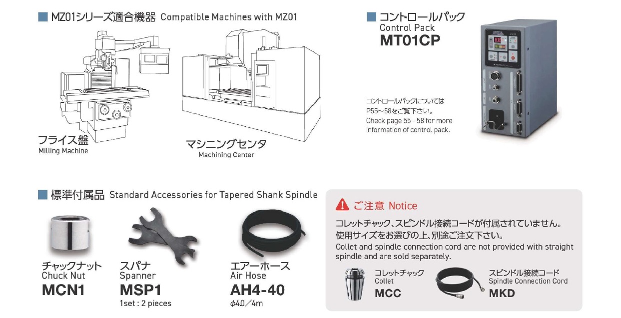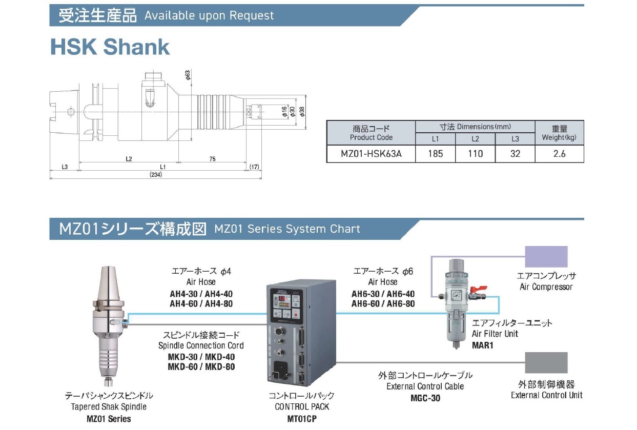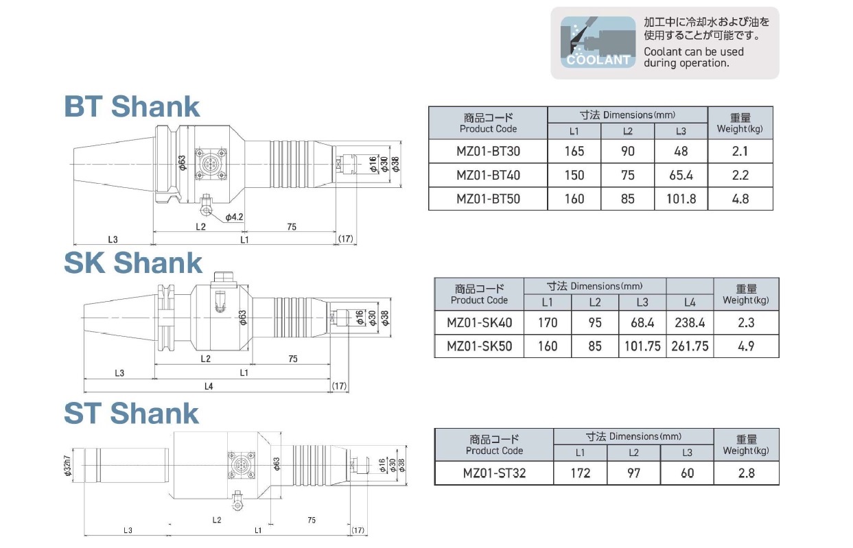 MZ01 Series, BT Shank, SK Shank, ST Shank, MT01CP, MCN1, MSP1, AH4-40, MCC, MKD, MZ01-BT30, MZ01-BT40, MZ01-BT50, MZ01-SK40, MZ01-SK50, MZ01-ST32, HSK Shank, MZ01-HSK63A, AH4-30, AH4-60, AH4-80, MAR1, MKD-30, MKD-60, MKD-40, MKD-80, MCC-30