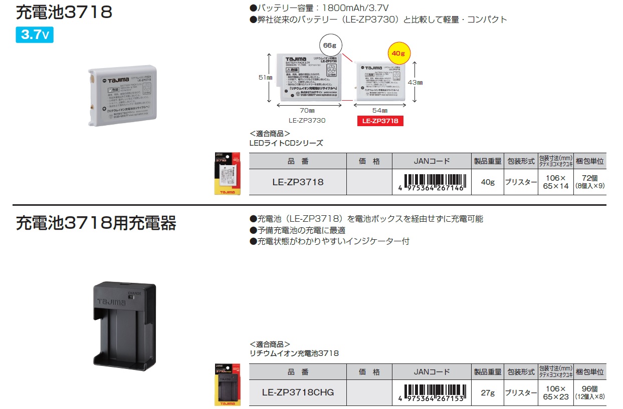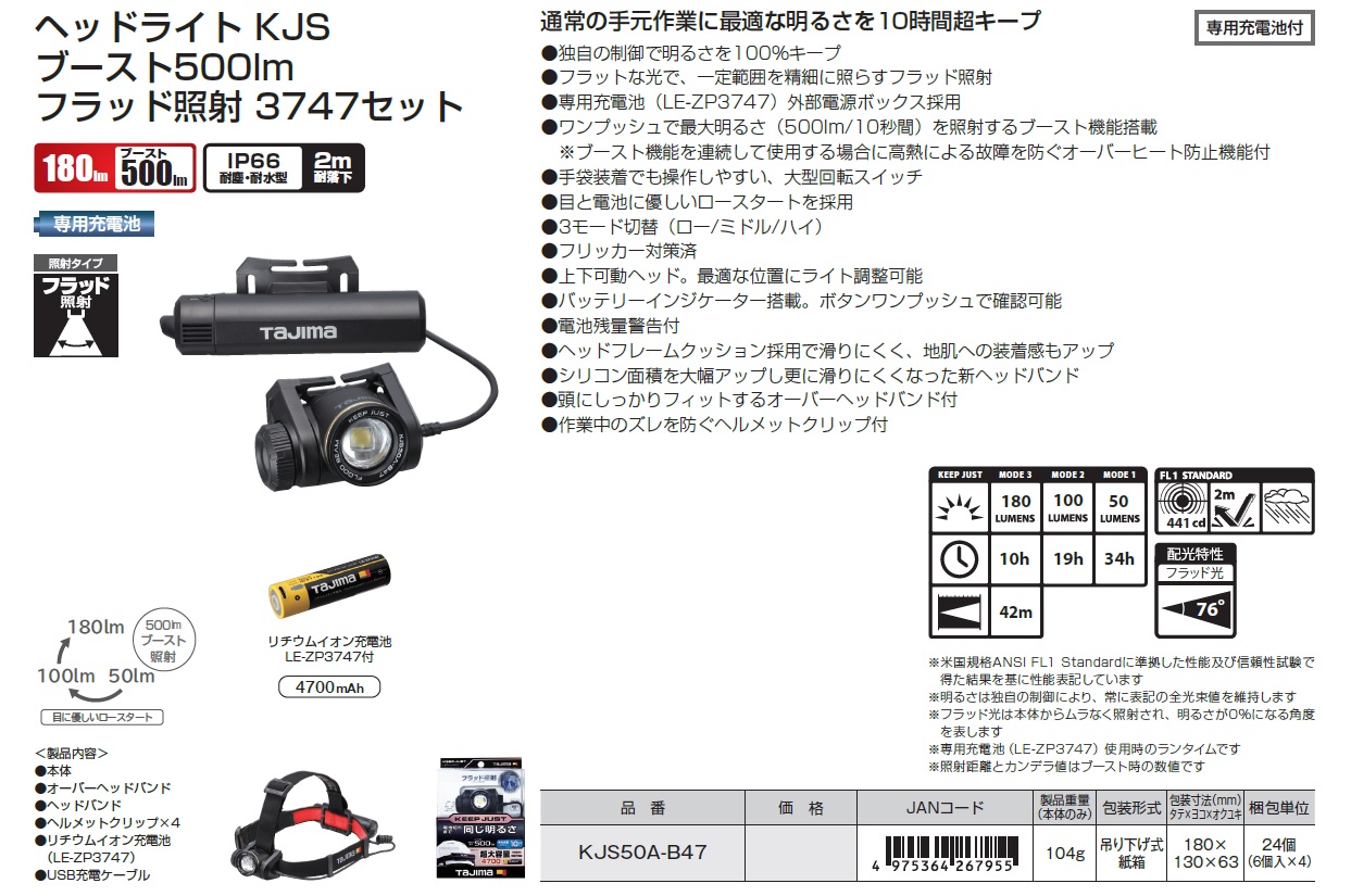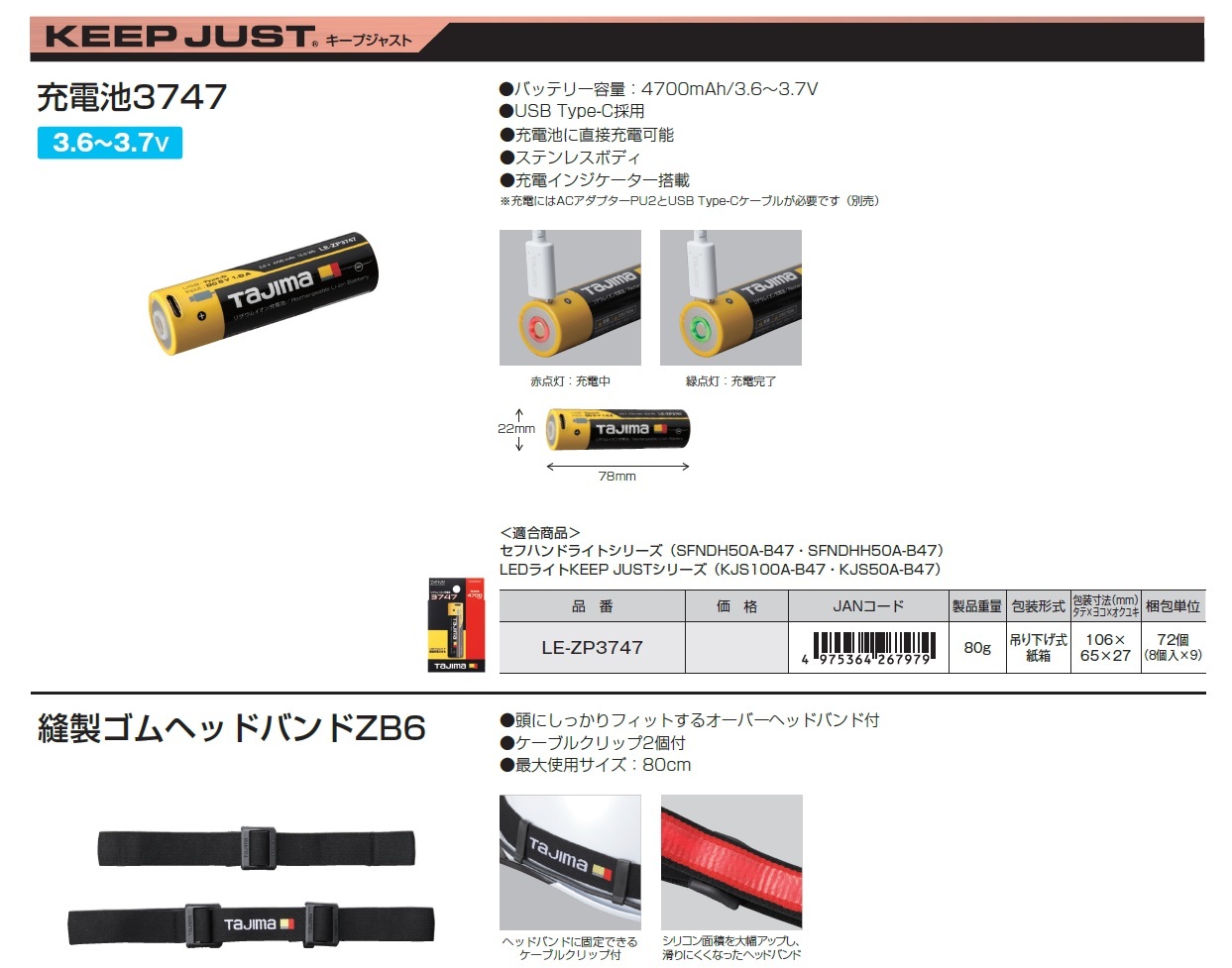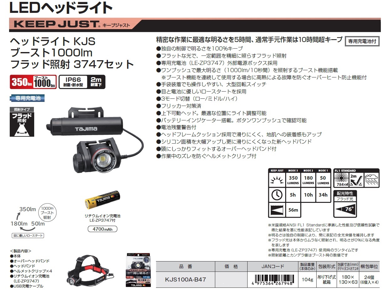 Tajima LED Headlight, Rechargeable Battery, AC adapter, USB Charging Cable, Lithium-ion Battery