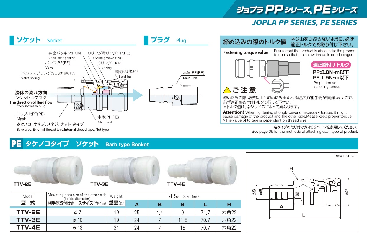 Joplax Jopla PP Series, PE Series, One-Touch Joint for Special Purposes, Barb Type Socket, External Thread Type Socket, Barb Type Plug